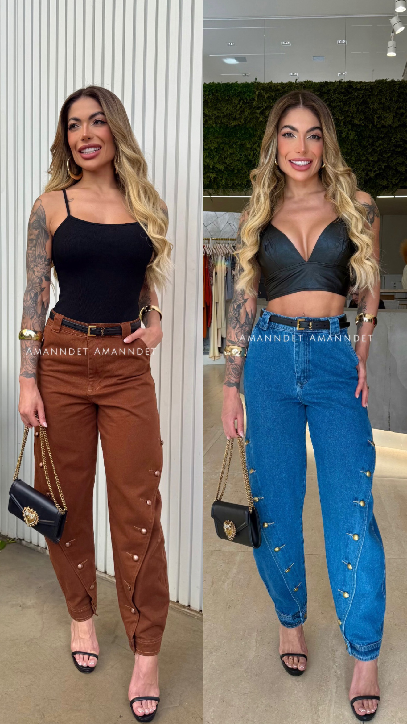 Calça jeans modelo cenoura cintura alta, fechamento em botão e zíper frontal, bolso dos dois lados, botões dourados nas laterais, na barra possui um detalhe com botão dando um charme para a peça, com dois bolsos na parte de trás. Essa calça é a escolha perfeita para quem busca estilo e conforto. Sua modelagem diferenciada realça a cintura e traz um toque fashionista ao visual.