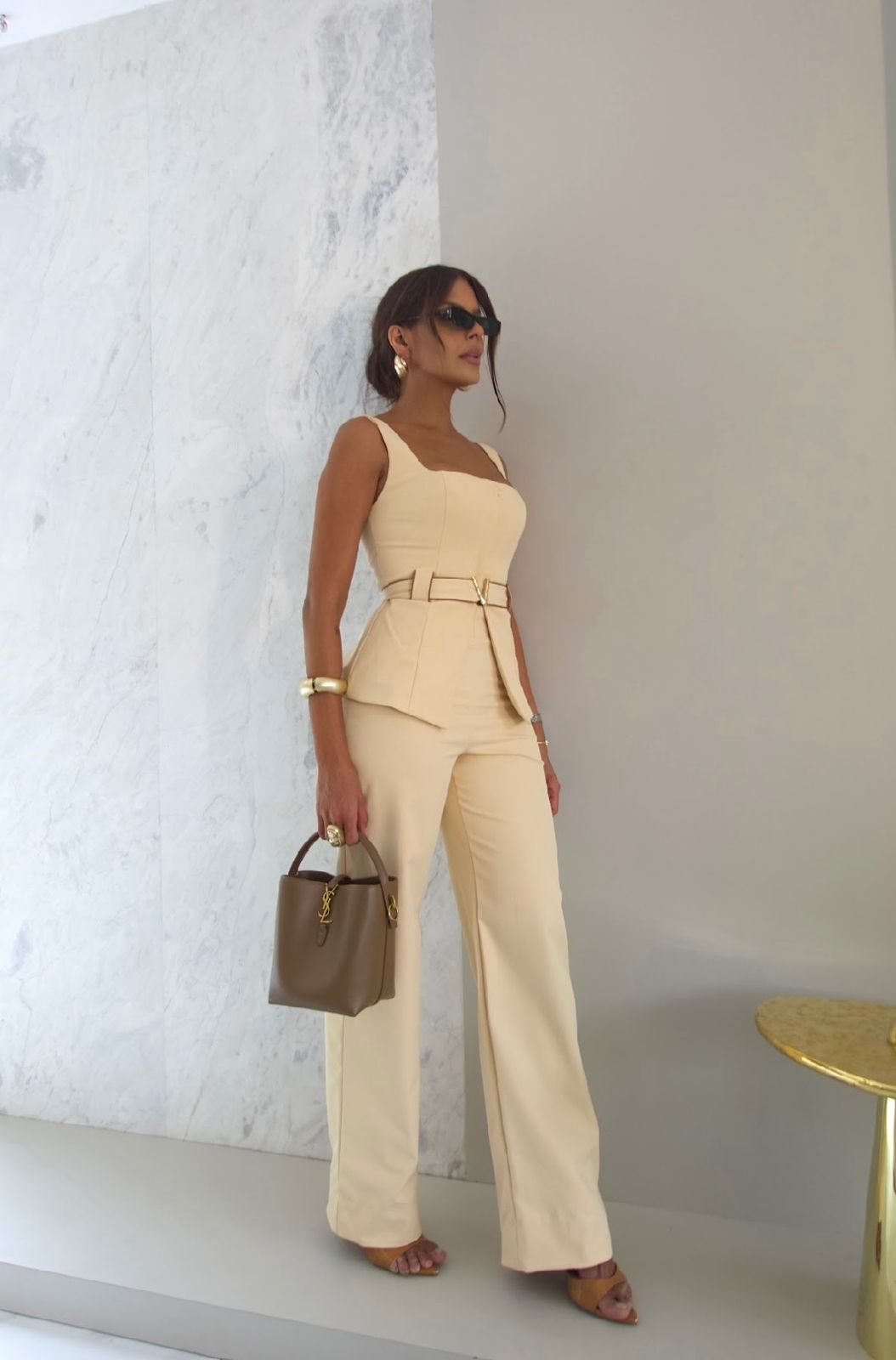 Conjunto confeccionado em tecido nobre na alfaiataria toque levemente peletizado, colete alongado, alças largas trazendo sustentação à peça, decote reto, não possui bojo, forro embutido garantido conforto e segurança ao vestir, fechamento frontal zíper na mesma cor da peça, abertura frontal dando um charme à peça, passantes na cintura com viés na cor marrom, acompanha cinto removível no mesmo tecido com aviamento frontal de metal em formato “V” na cor dourada , recortes estratégicos valorizando a silhueta. Calça cintura alta modelo pantalona, modelagem impecável, fechamento na parte de trás em zíper invisível na mesma cor da peça facilitando a vestibilidade. Um conjunto ideal para quem busca um visual marcante, versátil e cheio de atitude — do escritório ao evento especial.