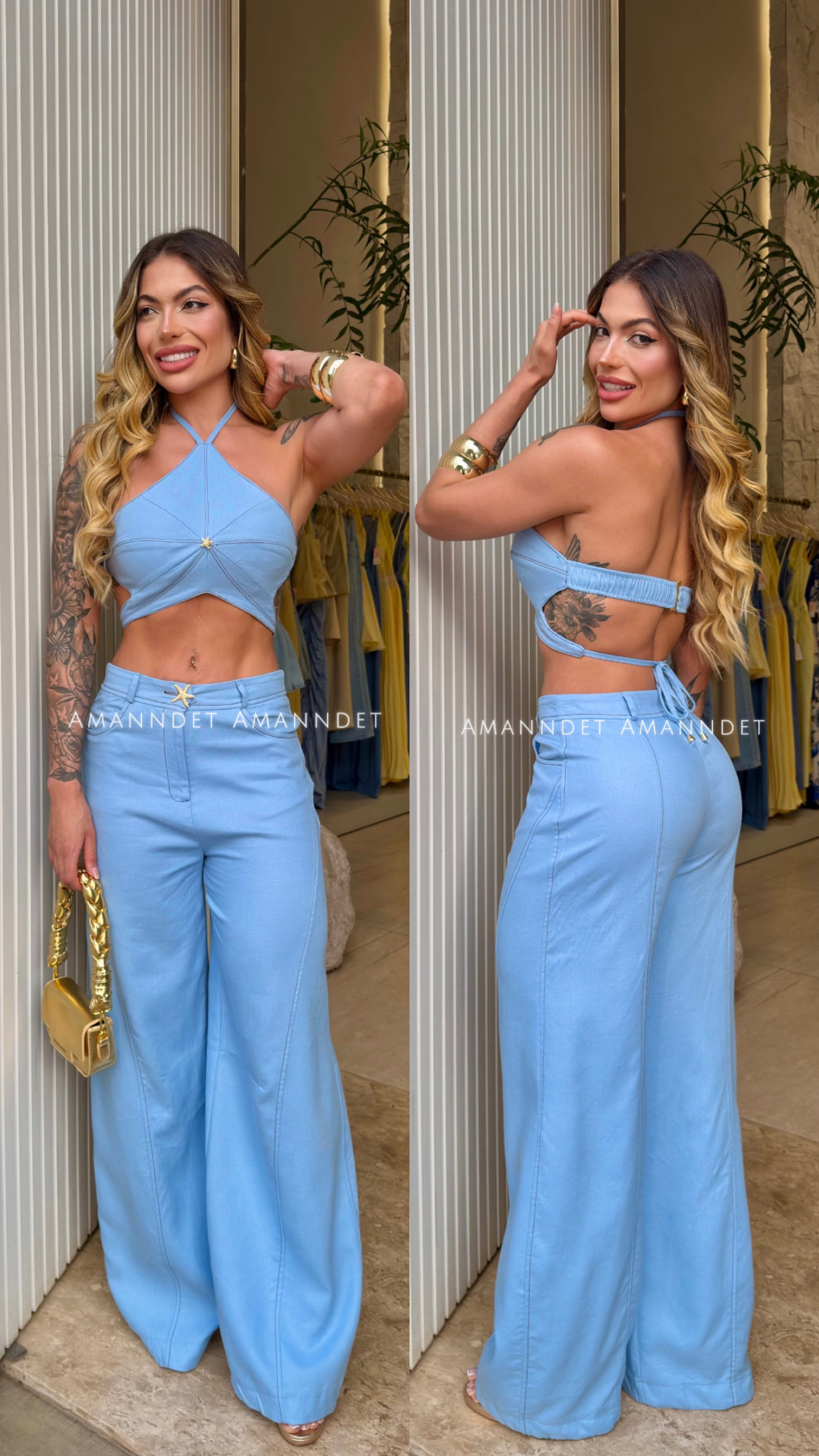 Conjunto confeccionado em tecido nobre no linho, cropped em formato de estrela, sem bojo, todo forrado em tecido duplo, amarração no pescoço, detalhe de aviamento em metal na cor dourada em formato de estrela, recortes estratégicos deixando um ar fashionista, costuras em tom contrastante que valorizam a modelagem e trás personalidade á peça, amarração finalizado com ponteiras de metal na cor dourada e elástico com fecho de metal na parte de trás facilitando o uso.