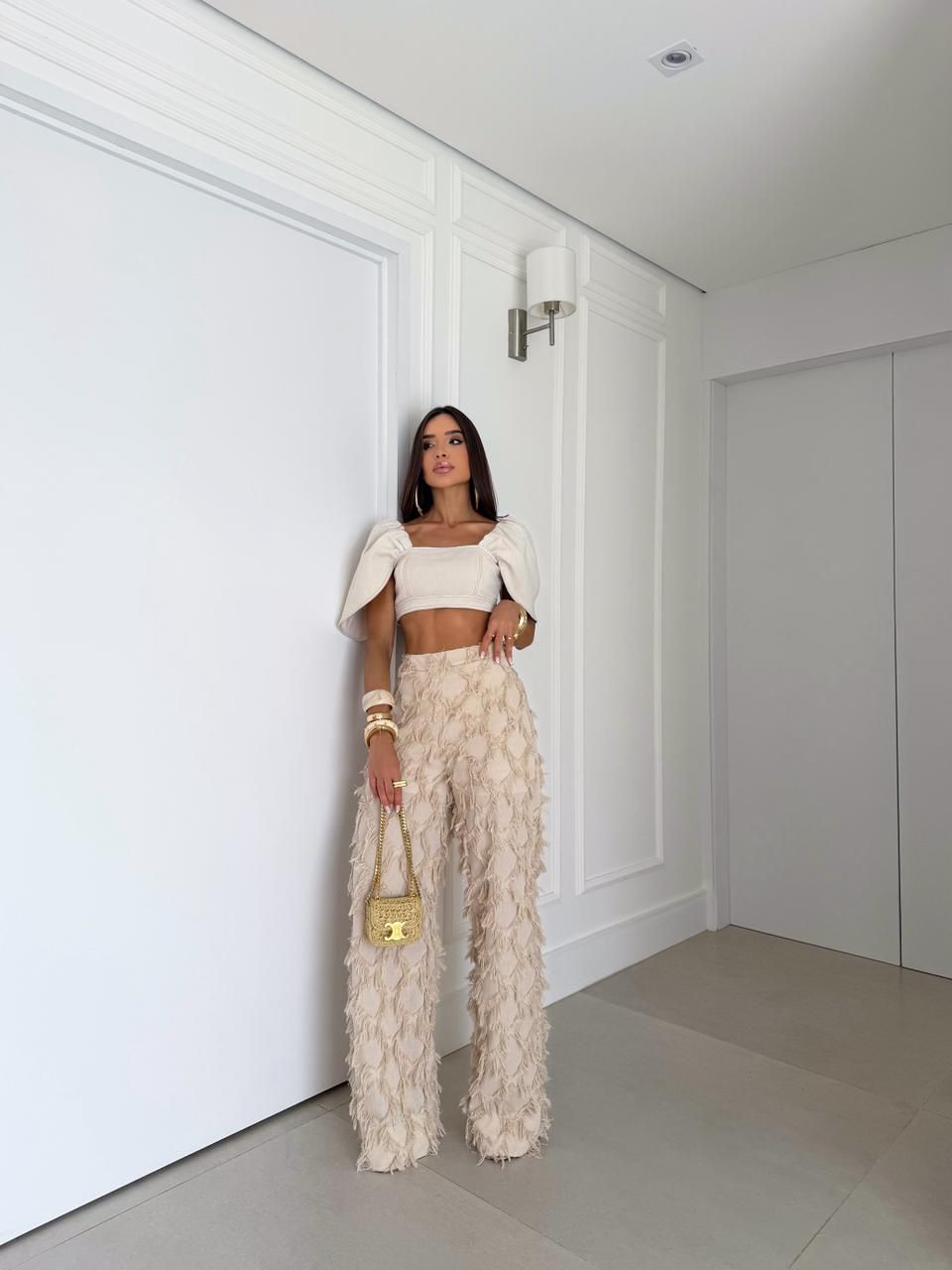 Conjunto confeccionado em tecido nobre no linho, cropped estruturado, decote reto, mangas amplas trazendo imponência e sofisticação à peça com elástico facilitando o uso, forrado em tecido duplo, sem bojo, recortes estratégicos deixando um ar fashionista, na parte de trás possui lastex facilitando a vestibilidade e fechamento em zíper modelo tratorado na cor dourada. Calça modelo pantalona, cintura alta, textura em relevo em toda à peça, criando movimento em um visual impactante, possui forro, na parte de trás fechamento em zíper modelo tratorado na cor dourada. Um conjunto elegante e moderno, perfeito para produções sofisticadas com personalidade.