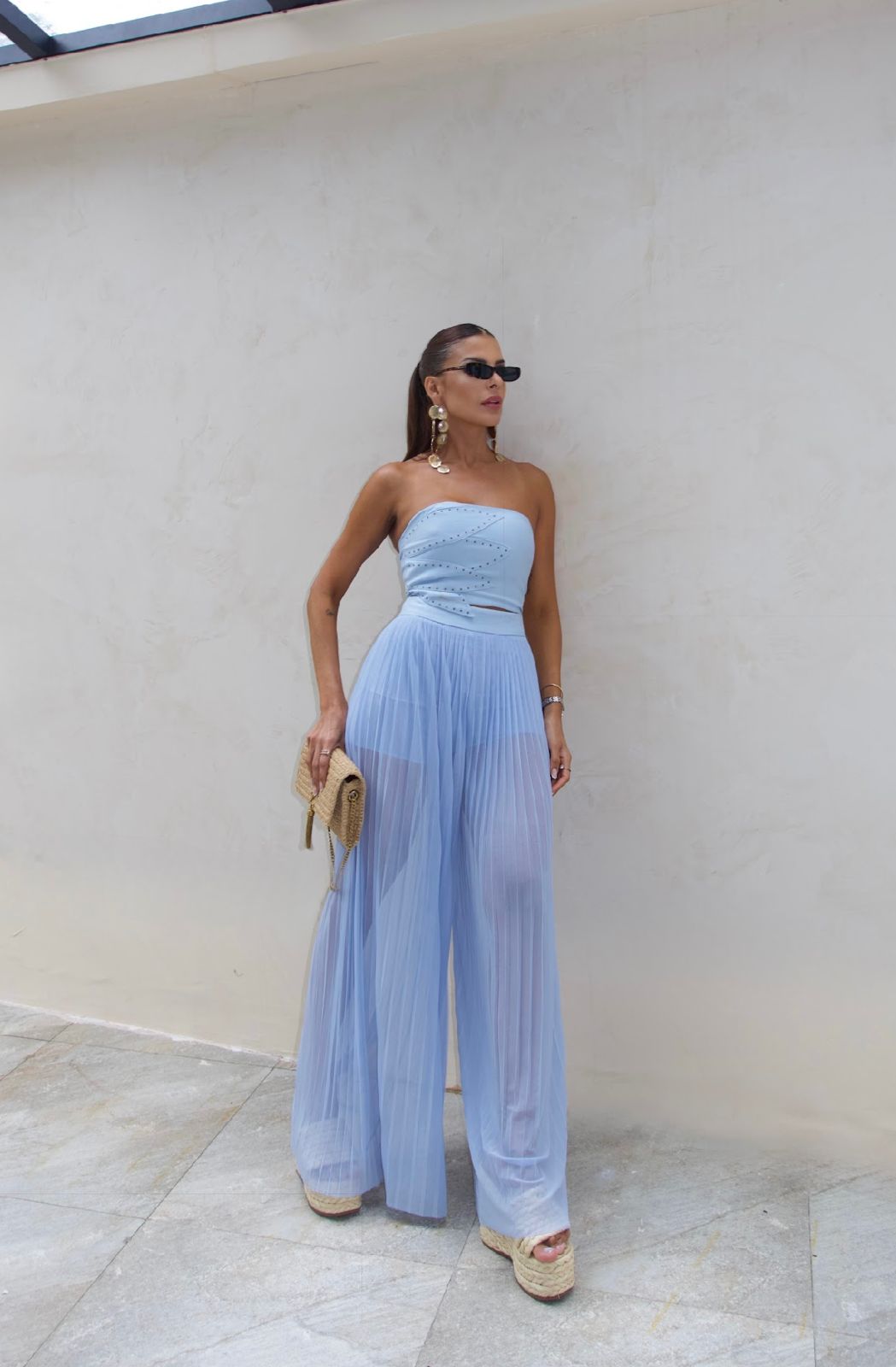 Calça confeccionada no tule plissado, cós no cotton nylon span e costuras embutidas, short de forro para maior conforto, modelagem impecável em seu corpo, na parte debaixo possui uma leve transparência proporcionando caimento fluido e efeito visual moderno, zíper invisível na parte de trás da mesma cor da peça, cumprimento de barra perfeito. Um conjunto leve, moderno e elegante.
