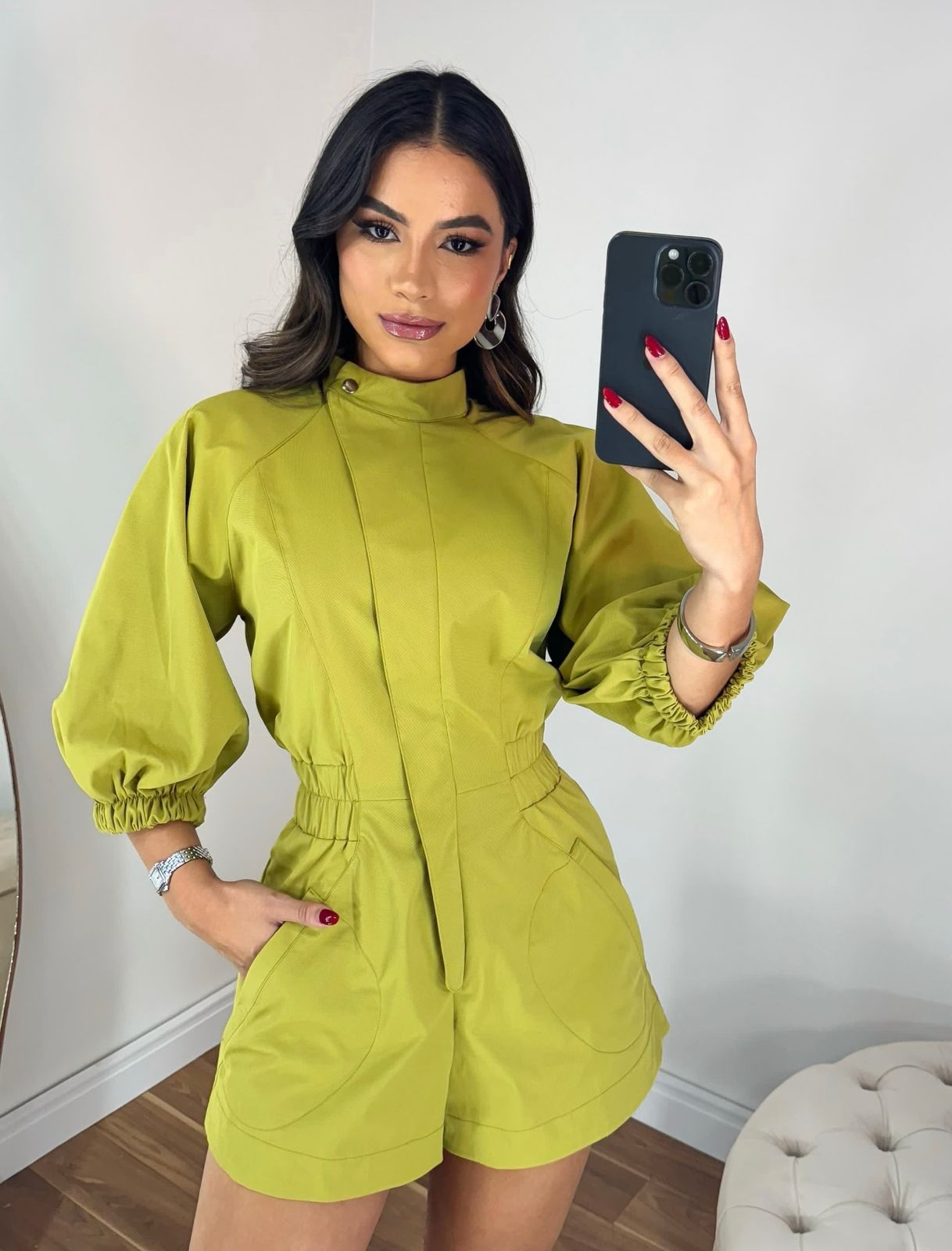 Mangas bufantes, mas não são armados. Detalhe de elástico no punho, e elástico na cintura, possui bolsos nas laterais e zíper na frente de fora a fora com detalhe de botão no pescoço, pode ser usado aberto ou fechado.