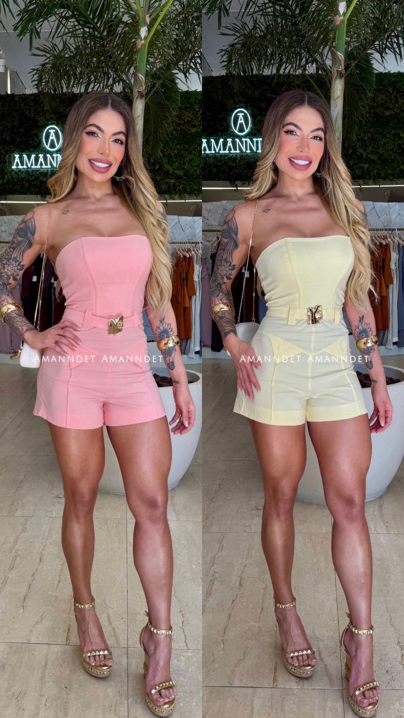 Macaquito confeccionado em tecido nobre na alfaiataria com elastano, modelo tomara que caia, tecido duplo e barbatanas na região do busto deixado a peça estruturada em seu corpo, sem bojo, recortes estratégicos que valorizam a silhueta de forma delicada e natural, passantes na cintura, acompanha um cinto do mesmo tecido com aviamento de metal na cor dourada em formato orgânico, fechamento em botões. Na parte das costas ele é todo fechado porém sem perder o contorno do seu corpo fechamento em zíper invisível facilitando a vestibilidade. Uma peça ideal para quem busca um visual leve, moderno e cheio de estilo.
