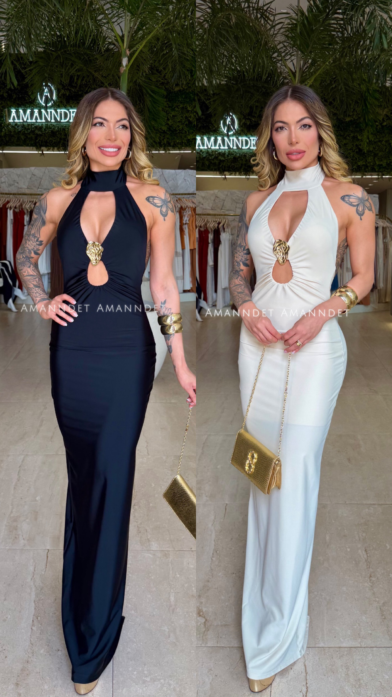 Vestido longo confeccionado tecido nobre na malha top beach, todo forrado, gola alta com fechamento em botões no pescoço na cor dourada, decote central com leves drapeados e detalhe de aviamento em metal em formato orgânico na cor dourada, elástico no decote facilitando o uso, decote na parte de trás dando um charme e personalidade à peça, fenda central atrás trazendo liberdade de movimento. Um vestido que transforma qualquer ocasião em um momento inesquecível.