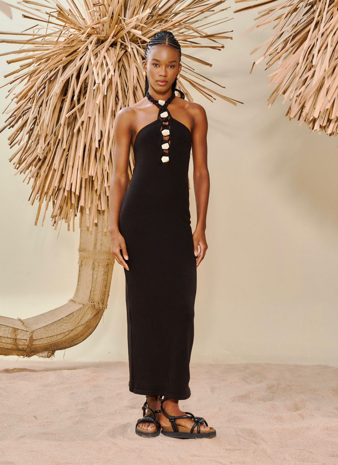 Vestido Longuete coleção Open, confeccionado em tecido nobre no tricot, modelagem justa que valoriza a silhueta, sem bojo, detalhe em nós central é o protagonista, entrelaçados com aviamentos na cor creme de onde parte a alça de cordão que amarra no pescoço, um detalhe artesanal que enriquece a peça.