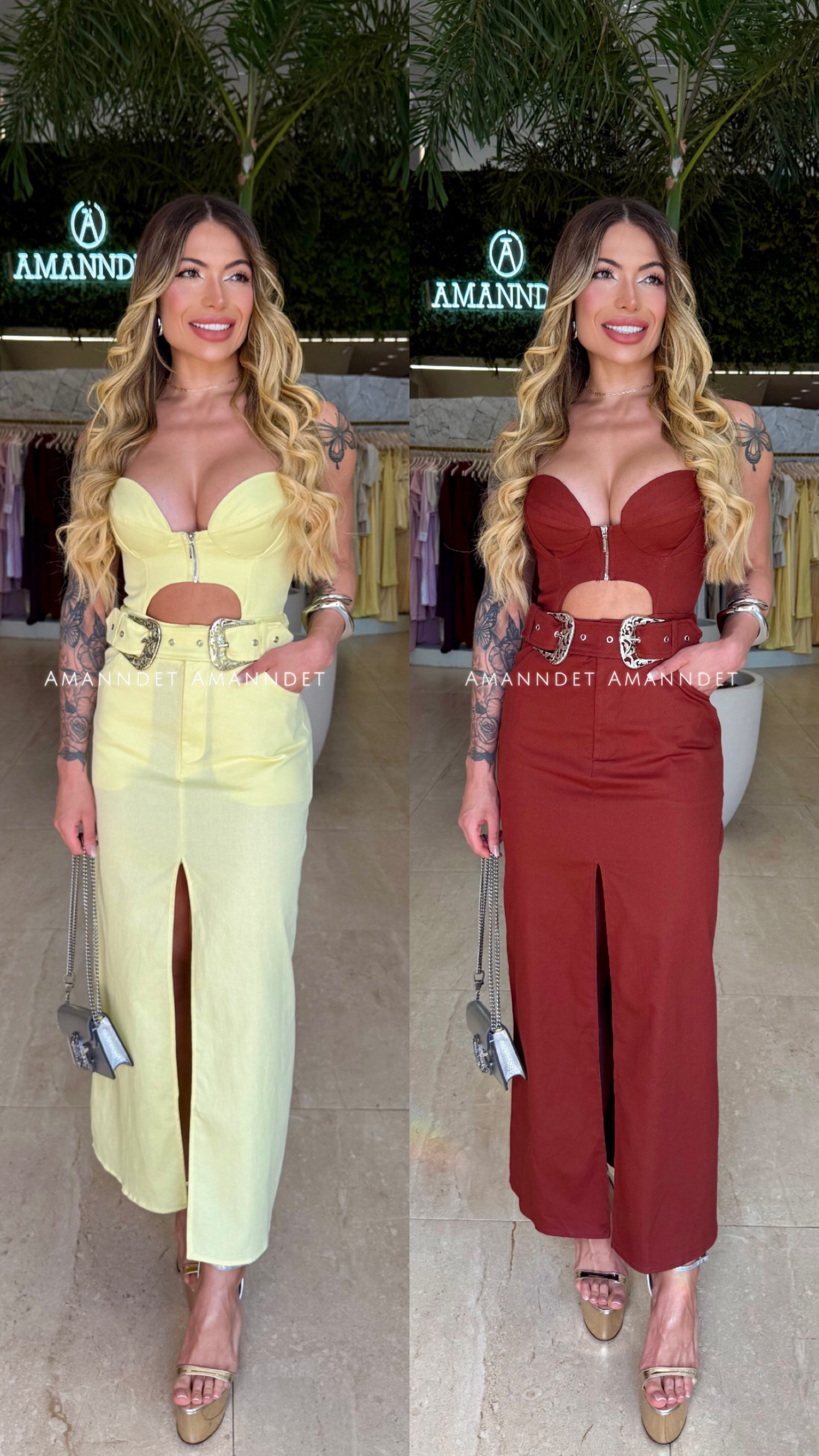 Vestido midi confeccionado em tecido nobre na sarja, decote modelo meia taça, fechamento em zíper frontal de metal modelo tratorado na cor prata, sem bojo, tecido duplo, leve abertura abaixo do busto, na cintura possui cinto no mesmo tecido em duas fivelas de metal na cor prata costurado na peça, a parte da saia possui fechamento frontal em botão e zíper, bolsos nas laterais, fenda central trazendo elegância e conforto para a peça. Na parte das costas ele é todo fechado porém sem perder o contorno do seu corpo. Um vestido com o corte clássico com um toque ousado, criando uma peça versátil e sofisticada.