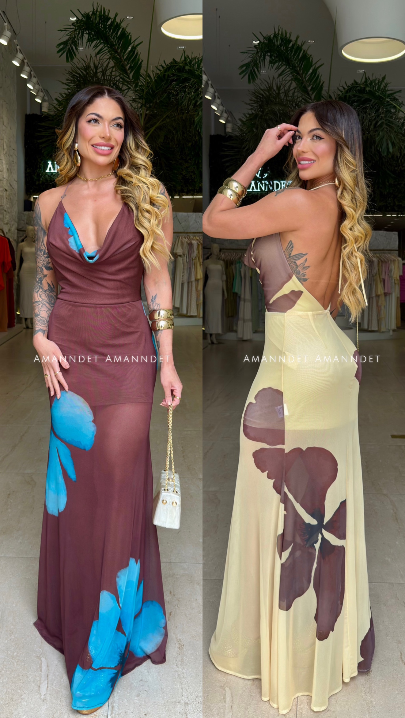 Vestido Longo confeccionado em tecido nobre no tule, estampa exclusiva, decote degagê que valoriza o colo com delicadeza e um caimento suave e fluido, forrado, sem bojo, amarração no pescoço finalizado com ponteiras de metal na cor dourada facilitando o uso, decote nas costas trazendo sensualidade elegante, equilibrando romantismo e modernidade em uma peça leve e marcante, acompanha saia de forro avulsa no mesmo tom, permitindo diferentes propostas de uso: com o forro, a peça se transforma em um vestido leve e sofisticado; sem o forro, pode ser usada sobre biquíni como uma saída de praia cheia de estilo e personalidade, fechamento na parte de trás em zíper invisível na mesma cor da peça. Uma peça versátil, perfeita para transitar do casual chic ao resort wear com naturalidade.