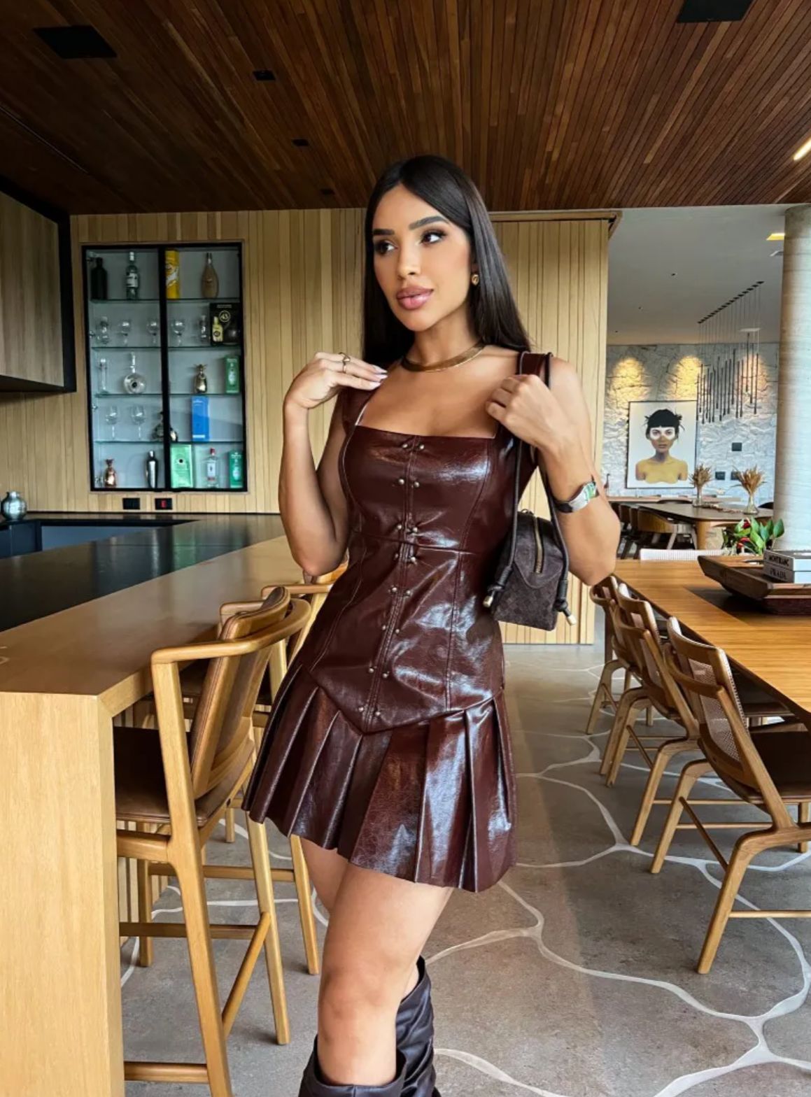 Vestido confeccionado em couro p.u acabamento brilhoso e estrutura impecável, modelagem ajustada no corpo com recortes estratégicos que valorizam a silhueta, forrado na região do busto, decote quadrado e alças médias, rebites decorativos frontal que trazem um toque moderno e ousado para a peça, na parte da saia tem leve volume com pregas estilo colegial trazendo fluidez e estilo, fechamento em zíper na parte de trás facilitando a vestibilidade. Uma peça fashion é impactante, ideal para compor looks noturnos cheios de atitude.