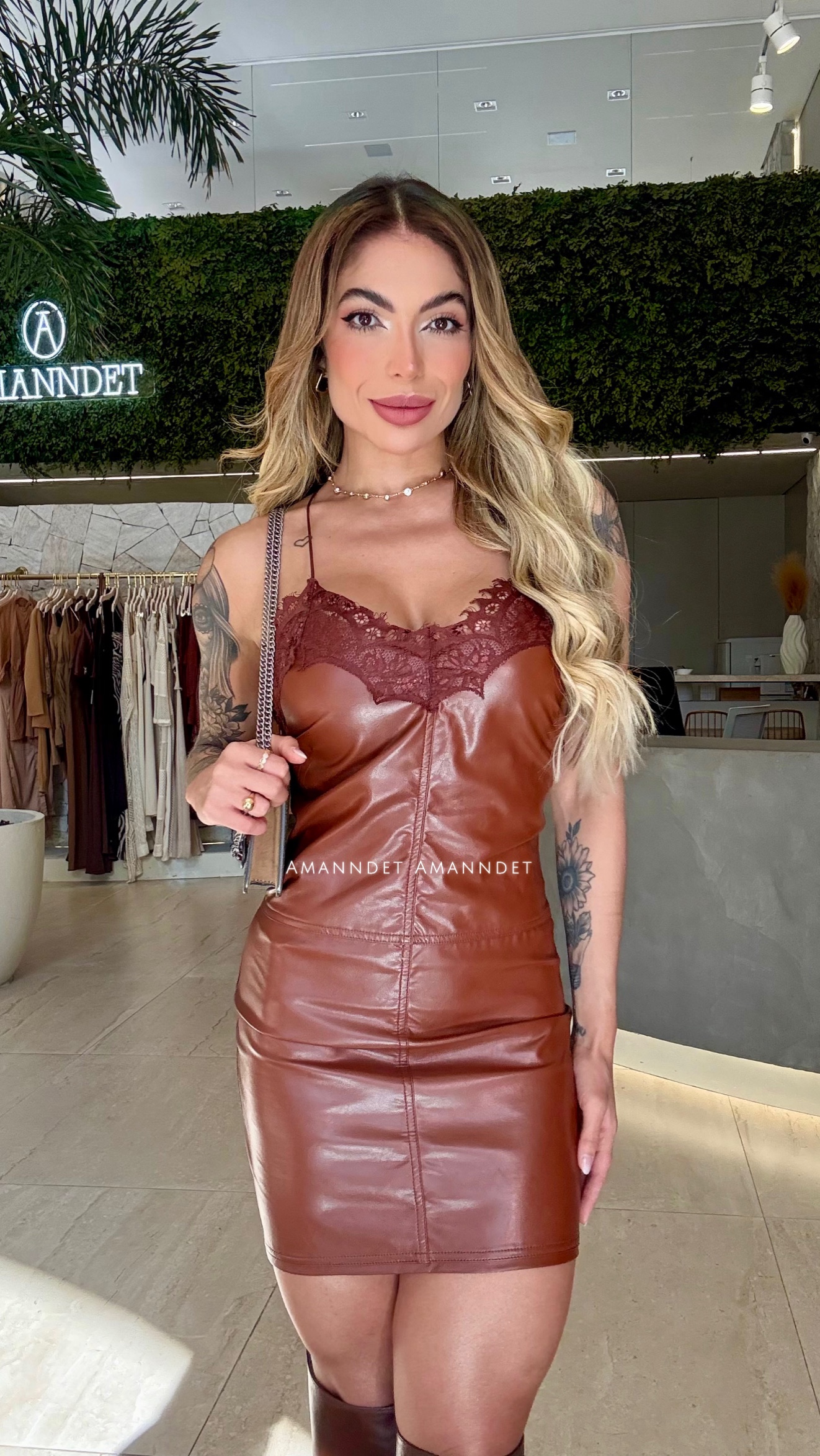 Vestido coleção Open confeccionado em tecido nobre no couro p.u, alças finas ajustáveis, decote em V com detalhes em renda que contornam toda a peça na parte superior deixando o visual moderno e delicado, sem bojo, nas costas possui amarração com ponteiras de metal na cor marrom, fechamento em zíper da mesma cor da peça, modelagem ajustada no corpo com recortes estratégicos que valorizam a silhueta, tecido extremamente encorpado aveludado por dentro não prega no corpo. Um design único e elegante, combinando a textura do couro p.u com a delicadeza da renda, cria um look cheio de personalidade.