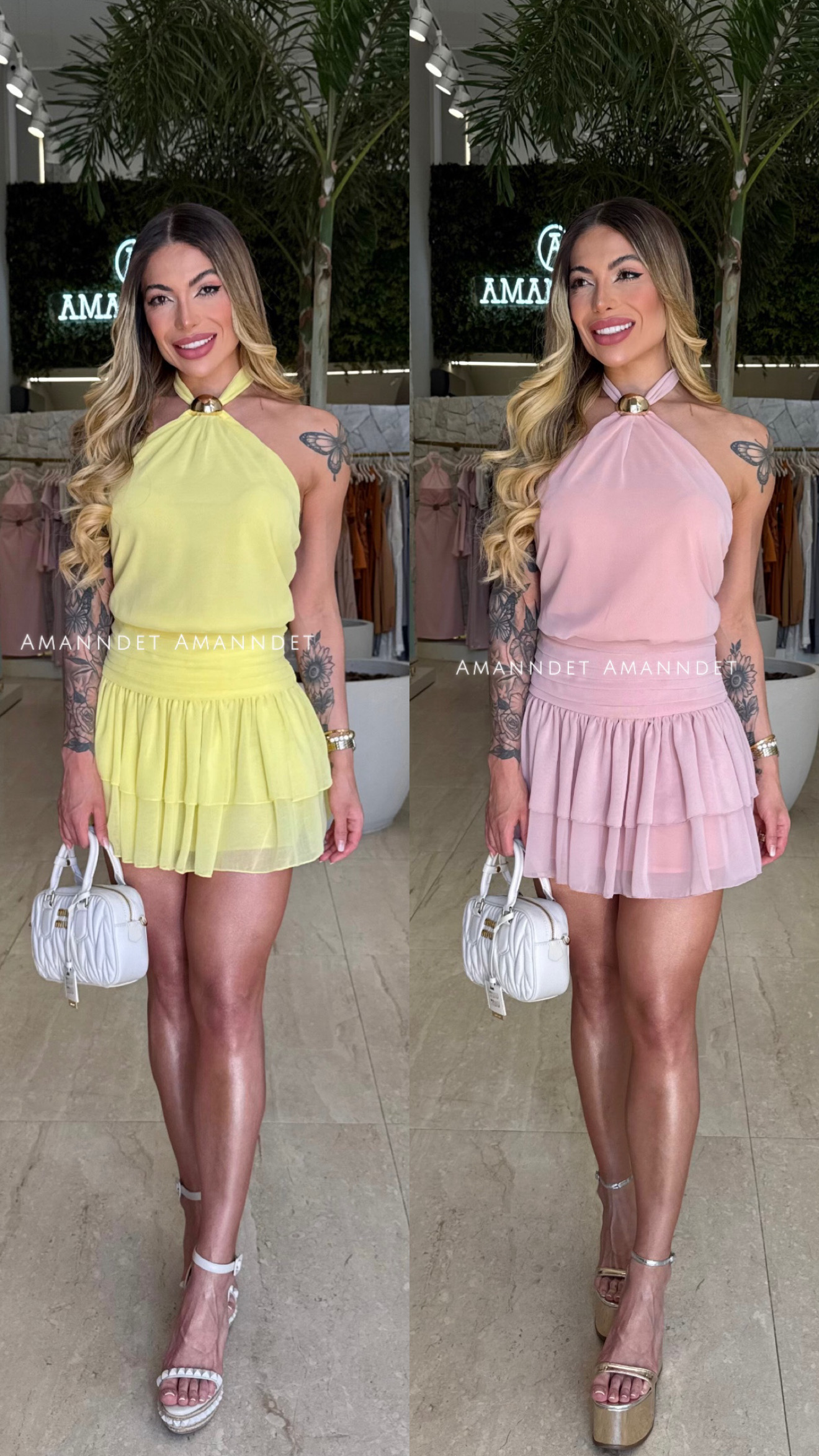 Vestido confeccionado em tecido nobre no crepe, gola modelo halter com aviamento em metal na cor dourada dando um charme para a peça, amarração no pescoço, tecido duplo, sem bojo, na saia possui detalhes em franzidos que contornam toda a peça e duas camadas de babados trazendo fluidez para a peça, toda forrada. Decote na parte de trás valorizando a silhueta com um toque de sensualidade sem perder a elegância, fechamento em zíper invisível da mesma cor da peça facilitando a vestibilidade. Um vestido com um toque leve e romântico, a escolha perfeita para um passeio á tarde, um almoço ao ar livre ou uma ocasião especial.