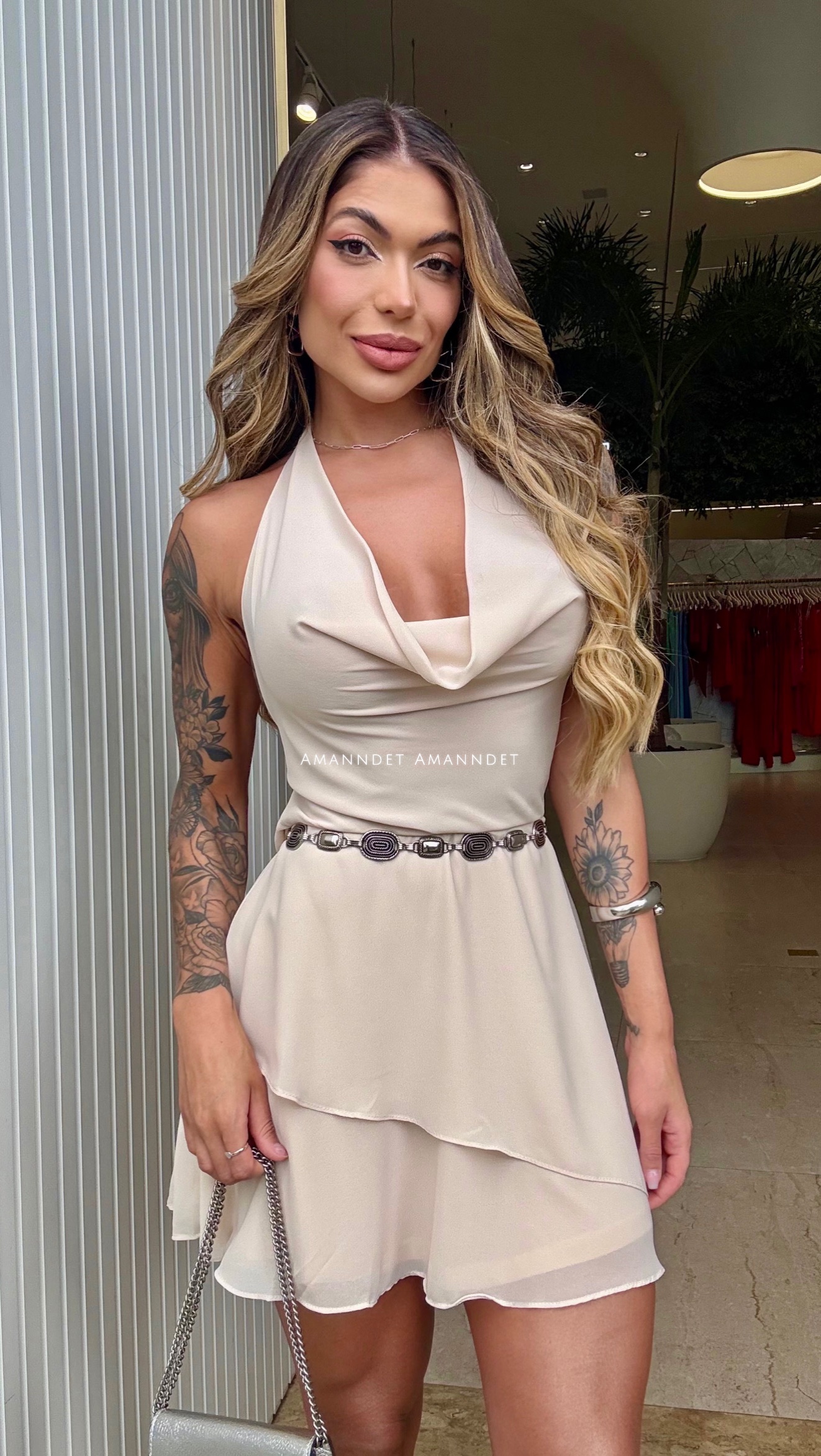 Vestido modelo curto, amarração no pescoço, possui decote em degagê, tecido nobre na alfaiataria, um lindíssimo decote na parte de trás e amarração com ponteiras de metal prata, elástico na parte da cintura, facilitando a vestibilidade, detalhes em babado na parte de baixo, possui forro, acompanha um lindo cinto de metal prata, trazendo uma sofisticação e charme para a peça.