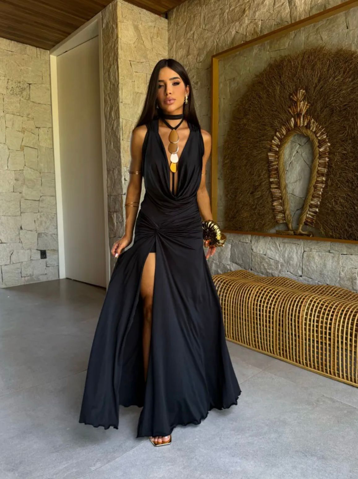 Vestido Coleção Pimpnella, confeccionado em tecido nobre na malha, drapeados nos ombros e maxi decote em U, o destaque da peça está na amarração do pescoço adornada por aviamentos de metal em formato de gotas na cor dourada que complementam o decote e se conectam á pala da saia como se fossem acessórios já incorporados ao design, decote cruzado na parte de trás criando um efeito surpreendente e feminino, a saia possui drapeado na lateral, maxi fenda garantido fluidez e leveza ao caminhar, acompanha short de forro cós alto no mesmo tecido. Um vestido ideal para ocasiões onde você quer ser o centro das atenções.