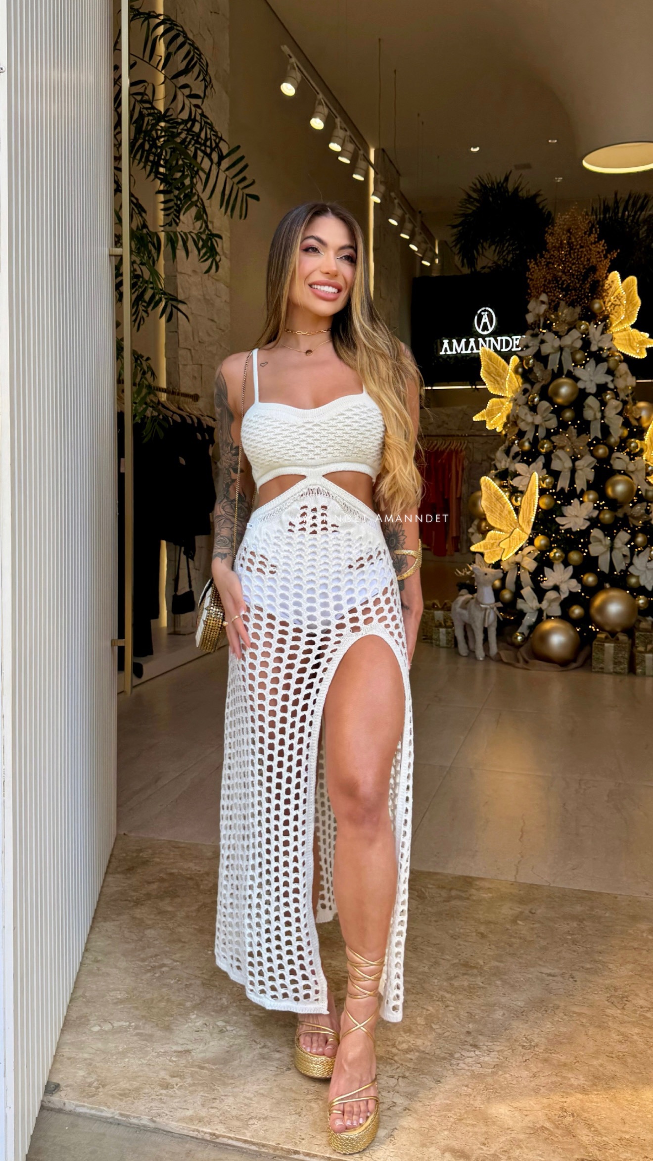 Vestido midi alongado em crochê off-white, com um design sofisticado e sensual. A peça apresenta alças finas, enquanto os recortes na cintura valorizam a silhueta e trazem um toque moderno. O padrão vazado do crochê cria uma leve transparência, destacando a beleza do trabalho artesanal. A sala possui uma fenda lateral, adicionando movimento e elegância ao look. Este vestido é uma escolha perfeita para quem busca um visual leve, elegante e cheio de personalidade.