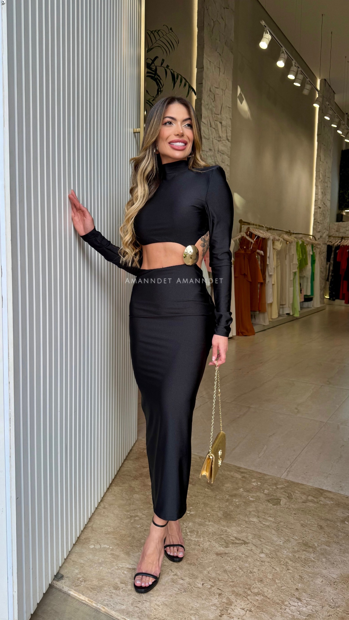 Vestido modelo longuete confeccionado no tecido malha royon, gola alta, manga longa, fechamento no pescoço em botões na cor grafite, todo forrado, não possui bojo, com ombreiras deixando a peça mais estruturada em seu corpo, recorte estratégico na cintura trazendo sensualidade sem perder a elegância, na lateral possui detalhe em aviamento de metal na cor dourada, decote na parte de trás dando um charme e personalidade para a peça. Com elástico na cintura facilitando a vestibilidade.