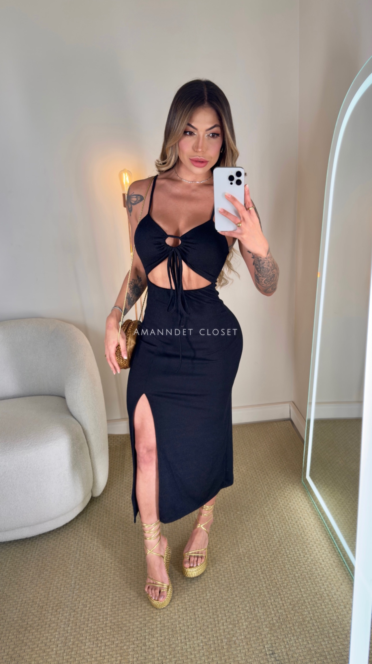 Vestido Midi, possui bojo, alças reguláveis, detalhe de amarração na parte da frente.