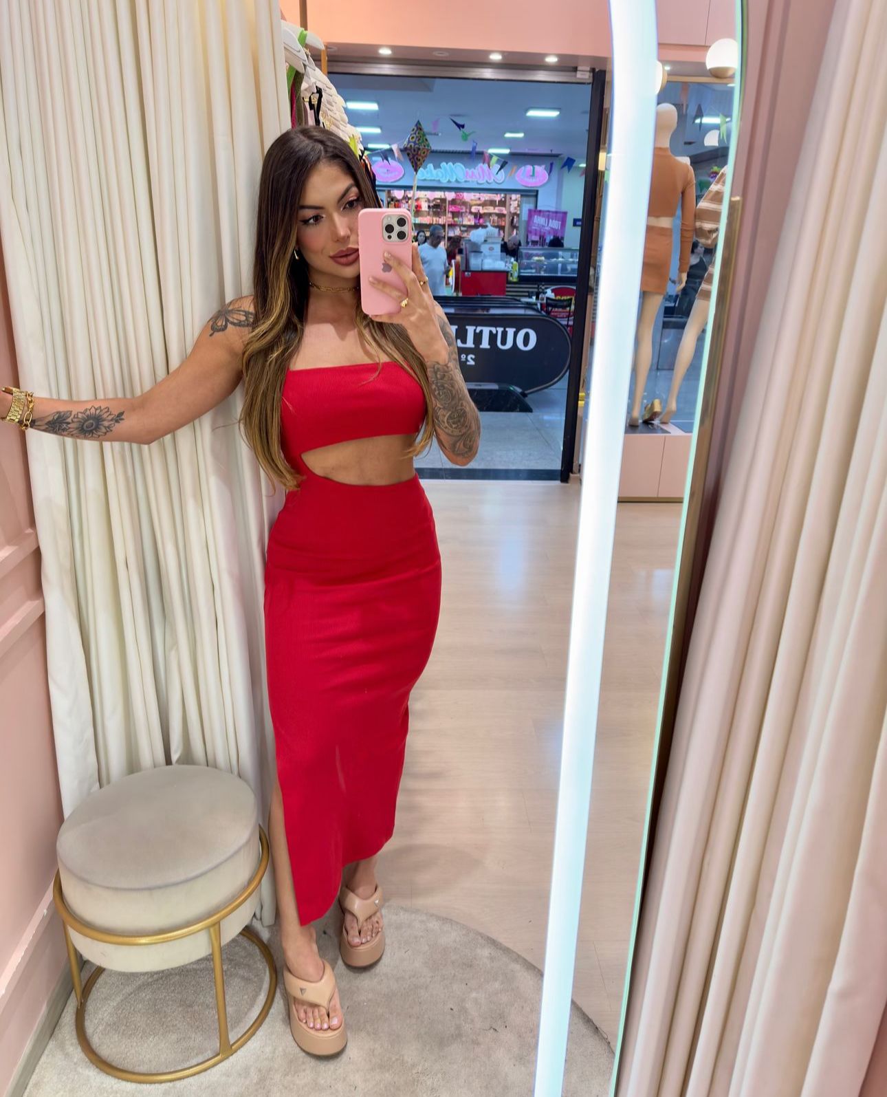 Vestido midi, sem bojo, alças reguláveis e fenda na lateral.
