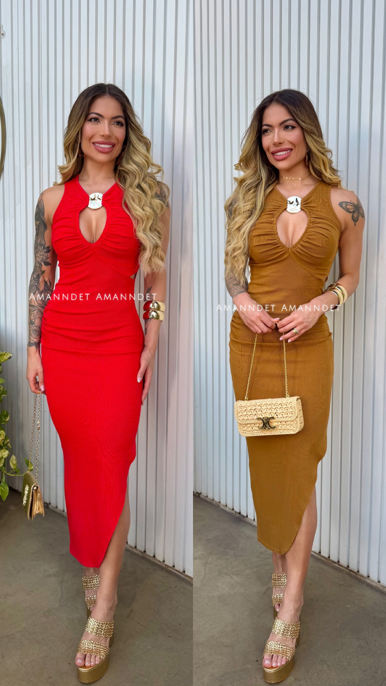 Vestido coleção Open confeccionado em tecido nobre no canelado premium trazendo toque macio e um caimento impecável, detalhe em aviamento central de metal em formato orgânico na cor dourada valorizando o busto, decote com elástico proporcionando um ajuste confortável e drapeados estratégicos dando um charme à peça, sem bojo, na lateral da cintura possui uma leve abertura tornando o modelo moderno e feminino, detalhe assimétrico na barra, fenda na lateral trazendo fluidez e modernidade à peça. Um vestido com personalidade, que mistura delicadeza, movimento e um toque de sensualidade.