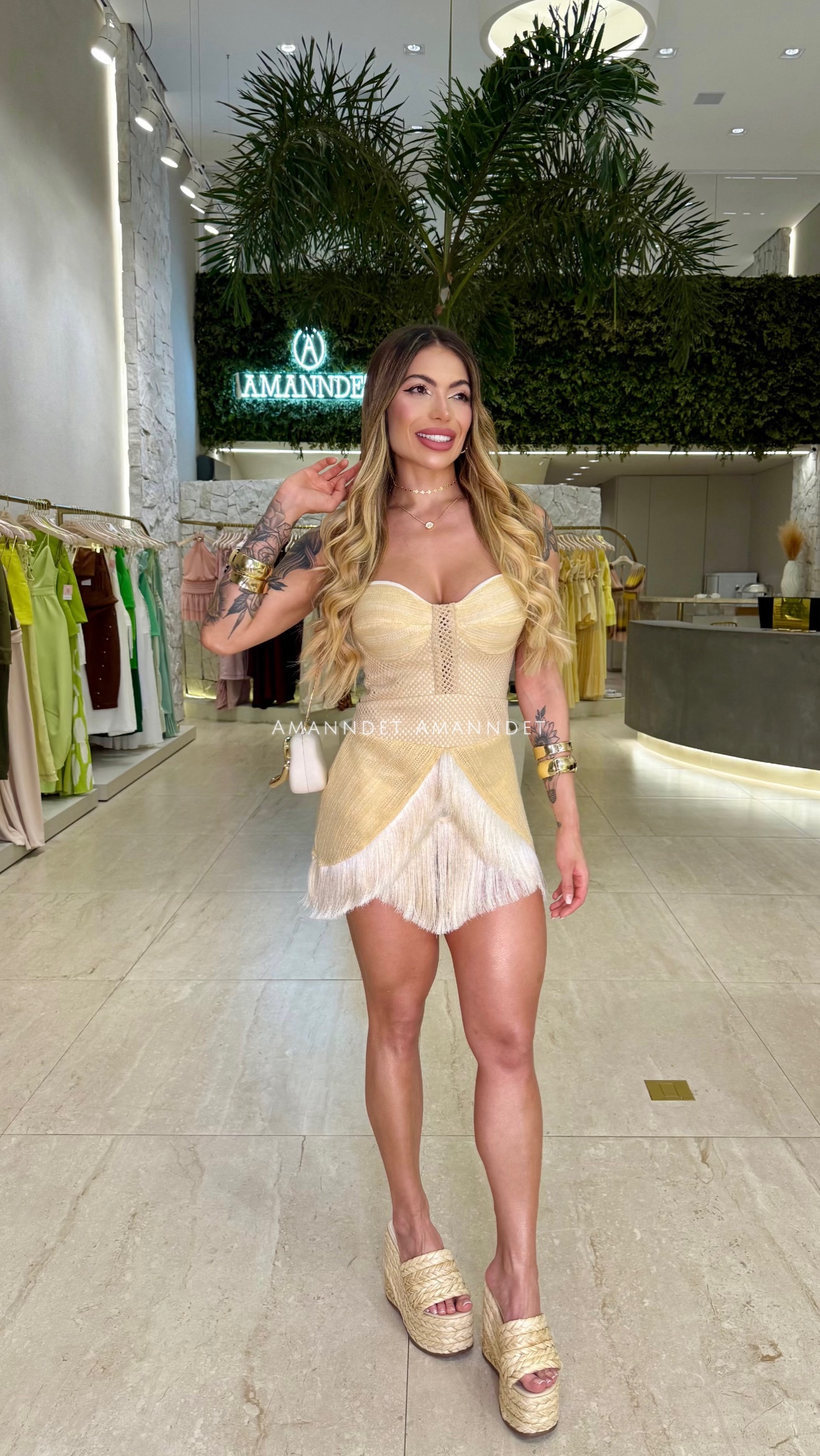 Vestido Coleção Pimpnella, confeccionado em tecido nobre no tricot, alças reguláveis, todo forrado, bojo estruturado que valoriza o busto, recortes estratégicos trazendo um caimento impecável, na parte da saia possui detalhes de franja artesanais aplicadas manualmente trazendo fluidez e sofisticação para a peça, forro interno em formato de short proporcionando conforto e liberdade nos movimentos, na parte de trás possui zíper invisível da mesma cor da peça facilitando a vestibilidade. Um vestido com design sofisticado perfeito para o verão.