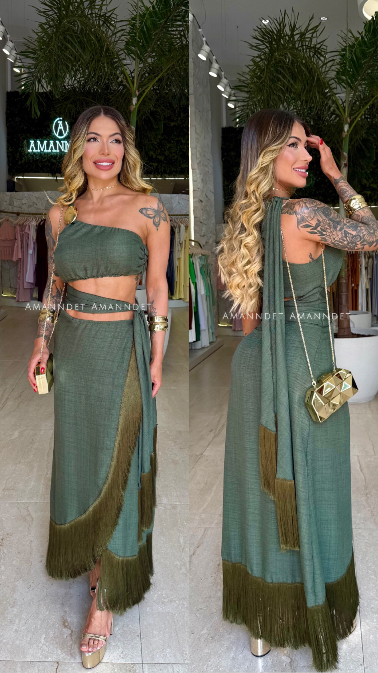 Vestido coleção Pimpnella, confeccionado em tecido nobre creponado, top nula manga com amarração no ombro, forrado em tecido duplo, com bojo, na alça possui aviamento de metal na cor dourada que ilumina e valoriza a peça, abertura e detalhe de amarração na cintura valorizando a silhueta, saia transpassada com ajustes em dois botões da mesma cor da peça, na barra possui franjas feitas a mão em subtom que acrescenta fluidez ao visual, fechamento em zíper invisível na parte de trás da mesma cor da peça facilitando a vestibilidade. Uma peça leve, sofisticada e confortável.